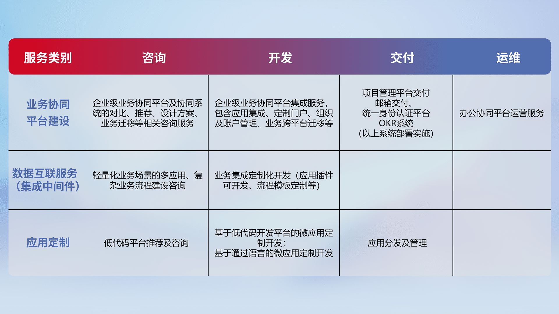 针对钉钉、、、企微、、、IDaas等平台级产品提供产品的规划、、、、方案、、、交付、、定制化开发等服务,,实现如统一协同办公、、智能客户服务、、混合会议管理、、智能数据查询、、等业务场景,,实现数字化转型。。。